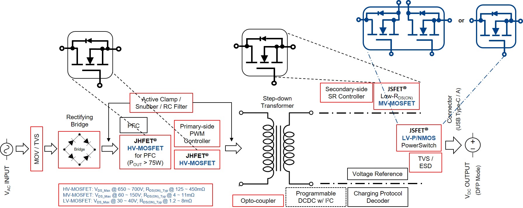 輸出功率從 18W 到 100W (甚至 120W 或更大) 、支持快充協(xié)議 (USB PD3.0/3.1, USB BC1.2, UFCS T/TAF 083-2022, Qualcomm QCxx, MediaTek PExxx、Huawei S/FCP, Oppo D/FCP, Samsung AFC, Apple 2.4A, …)、配置一個(gè)或多個(gè) USB Type-A 及 Type-C 輸出接口的快充充電器日益普遍。它們可以一物多用,同時(shí)為智能手機(jī)、平板、智能手表及筆記本電腦等萬物互聯(lián)數(shù)字化終端里面的鋰電池快速充電。采用第三代半導(dǎo)體功率器件(氮化鎵 D/E-mode HEMT)的設(shè)計(jì),體積小巧以及使用時(shí)溫度不會(huì)燙手,由于因近年多家世界排名前列的智能手機(jī) OEM 不把充電器隨著新款手機(jī)一起標(biāo)配而形成曲棍球棒效應(yīng),使得這類小巧的快充充電器成為市場(chǎng)主流。 市場(chǎng)上的快充充電器,常用的交直流電源轉(zhuǎn)換拓?fù)涫?Flyback 及 LLC。Flyback 拓?fù)涑R娪诠β时容^小的設(shè)計(jì),LLC 拓?fù)鋭t常見于功率較大及對(duì)交直流電源轉(zhuǎn)換效率要求較高的設(shè)計(jì)。因?yàn)?BOM 相對(duì) LLC 拓?fù)浔容^簡(jiǎn)單,ACF-Flyback 拓?fù)湟查_始被中/小功率的設(shè)計(jì)采用,特別是初級(jí)使用高壓氮化鎵 HEMT 的設(shè)計(jì)。無論是那種拓?fù)?,快充充電器的?nèi)部結(jié)構(gòu)示意圖大概如上: 針對(duì)快充充電器的成用,捷捷微電 能提供完整的分立器件解決方案。比如,AC 輸入端防浪涌的 MOV、TVS、鉗制變壓器漏感而對(duì)原邊的高壓 MOSFETs VDS_Max 產(chǎn)生過壓的快恢復(fù)整流管、原邊 PFC (75W 以上的設(shè)計(jì)) 和匹配 PWM 的高壓 MOSFET、副邊同步整流中/低壓 MOSFETs、USB Type-A 及Type-C 端口的低壓 MOSFETs 及 ESD 保護(hù)等。