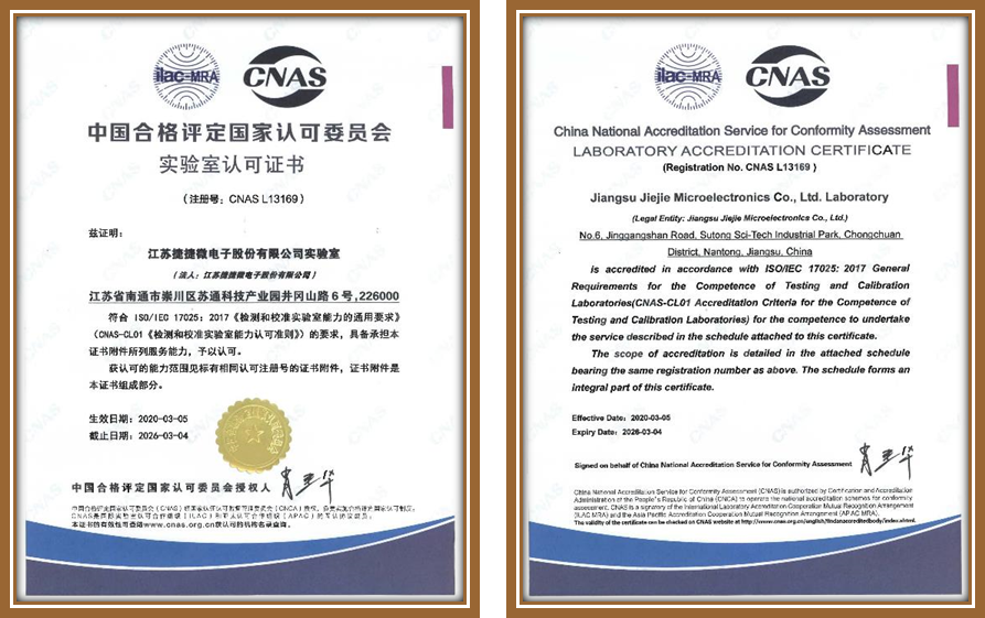 江蘇捷捷微電子股份有限公司實驗室測試中心,提供多種可靠性試驗,包括環(huán)境可靠性測試、板級可靠性試驗,使用壽命可靠性測試和全方位的失效分析服務。 捷捷微電子股份有限公司實驗室已經(jīng)獲得中國合格評定國家認可委員會的實驗室認可證書(CNAS認證) 江蘇捷捷微電子股份有限公司實驗室測試中心成立于 2011 年,分南通、啟東、深圳3個測試場地?,F(xiàn)有工作人員50名,其中管理人員 5 名,檢測人員 45名,簽字授權(quán)人4名,中級職稱人員2名,助理職稱人員6名,本科學歷人員21名。實驗室占地面積2000平方米,南通1200平方米,啟東800平方米。2018年8月發(fā)布并實施實驗室管理體系,并在2020年3月取得CNAS實驗室認可證書(L13169)。實驗室現(xiàn)有各類設備近170臺,可開展可靠性試驗項目20余項,浪涌過電壓檢測項目10余項,失效分析10余項以及特性測試等項目。與中科院微電子所、西電、中車等單位存在長期合作關(guān)系。